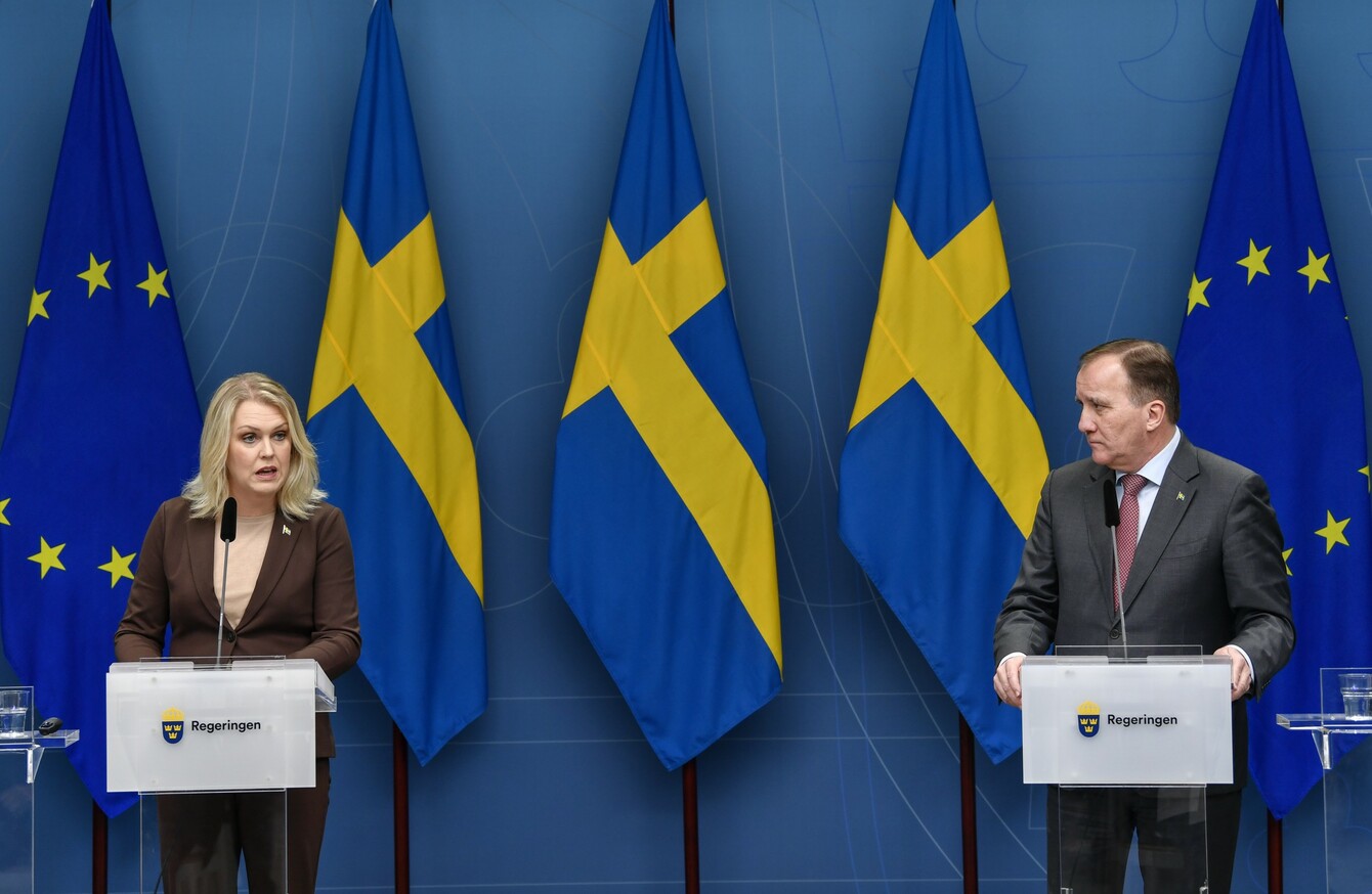 Social minister lena hallengren (l) and prime minister stefan löfven hold a news conference in the government offices regarding the availability of materials in the healthcare sector.